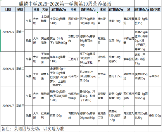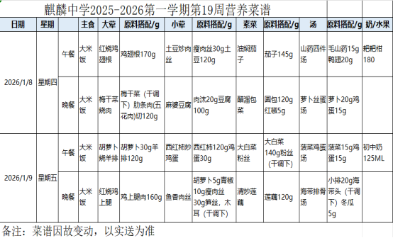 麒麟中学2025-2026第一学期第19周中、晚餐菜谱