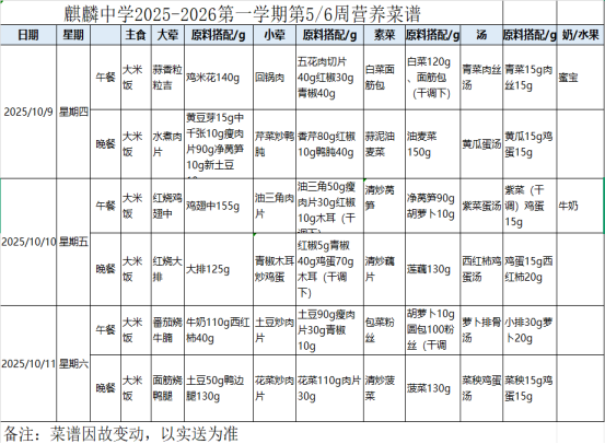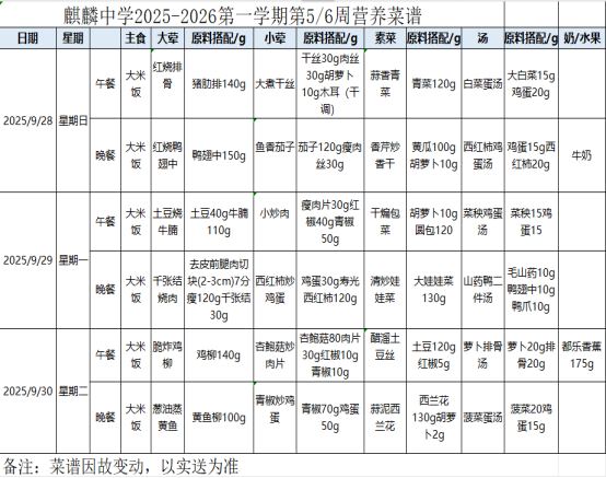 麒麟中学2025-2026第一学期第5/6周中、晚餐菜谱