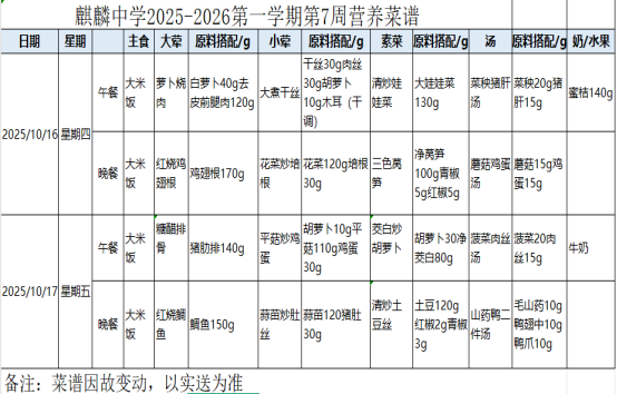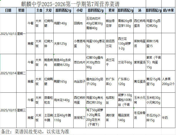麒麟中学2025-2026第一学期第7周中、晚餐菜谱