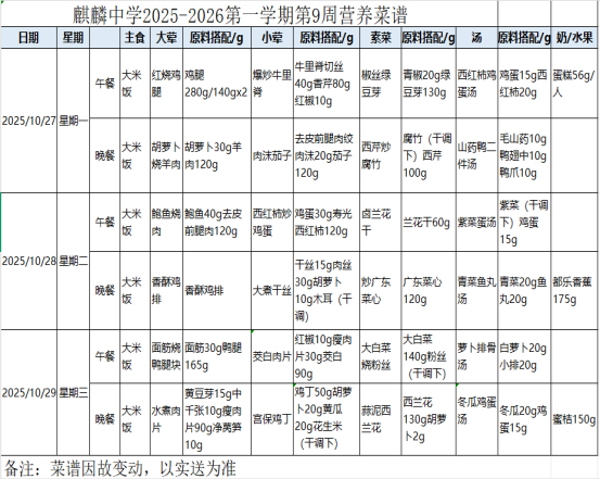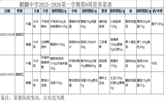 麒麟中学2025-2026第一学期第9周中、晚餐菜谱