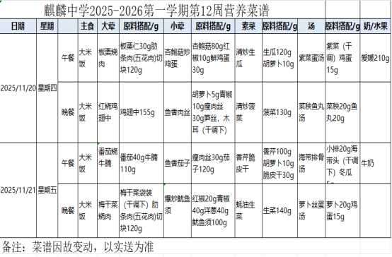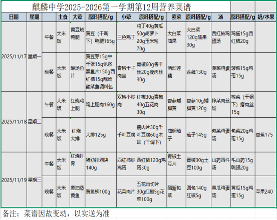 麒麟中学2025-2026第一学期第12周中、晚餐菜谱