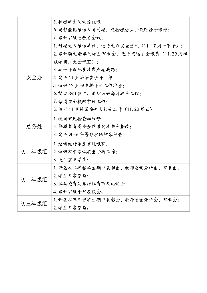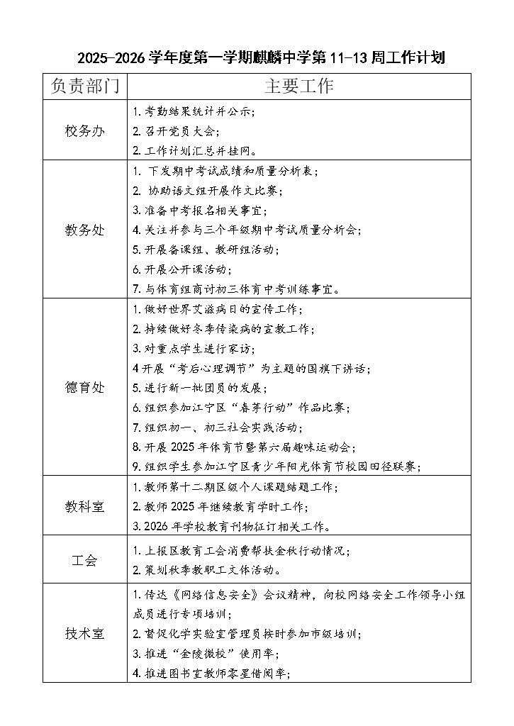 2025-2026学年第一学期第11-13周工作计划